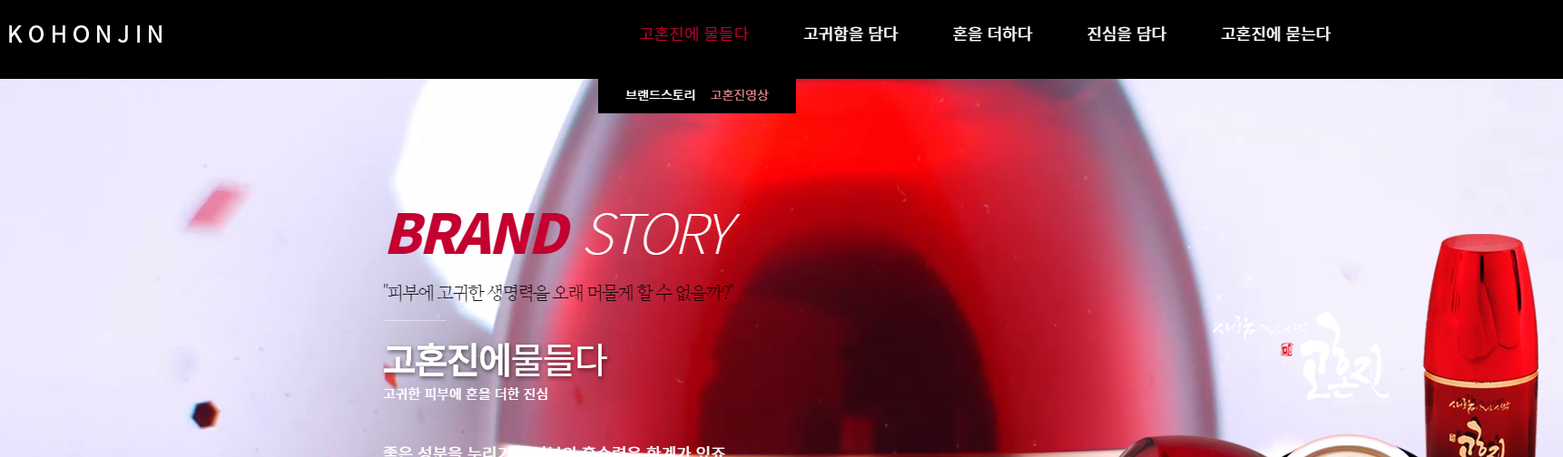 역시나 홈페이지를 통해서 확인을 해보시는 것이 가능하겠는데요. 상단에 있는 혼을 더하다라는 메뉴를 선택을 해주시면 되겠습니다. 그리고 페이지를 이동해주시고 나면 고혼진 인체적용시험 결과보고서라는 버튼을 확인해보실 수가 있겠는데요.