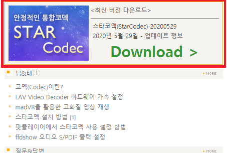 아울러 주의 사항도 함께 나와있으니 역시나 중요하게 읽어보셔야 하지 않을까 생각이 되는데요. 역시나 마찬가지로 기존에 사용을 하던 코덱이 있으면 삭제를 하고서 새롭게 받아서 설치를 해야한다는 내용이라는 점 참고해주시면 되지 않을까 생각이 됩니다. 아울러 참고하시면 좋을만한 정보가 정리된 곳이 있어서 잠깐 좀 알려드릴까 합니다. 바로 질문&답변이라는 메뉴를 활용하는 방법이라고 할 수가 있겠는데요.