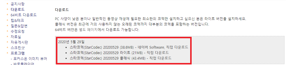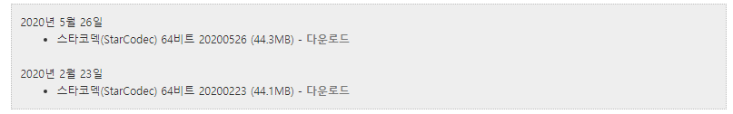 라이트와 클래식이 아닌 첫번째에 있는 스타코덱(starcodec) 항목 우측에 있는 글자를 눌러주시면 되겠습니다. 그러면 파일을 바로 받아보실 수가 있게 되겠는데요.