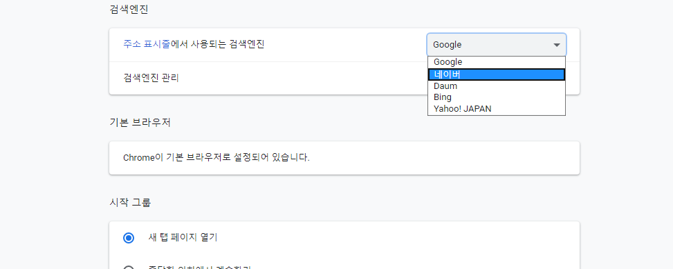 이후 주소 표시줄에서 사용되는 검색엔진이라는 항목 오른쪽에 있는 메뉴를 눌러주시게 되면 다양한 검색엔진들이 나오는 것을 확인하실 수가 있겠는데요. 이중에서 네이버를 선택해주시면 되겠습니다.