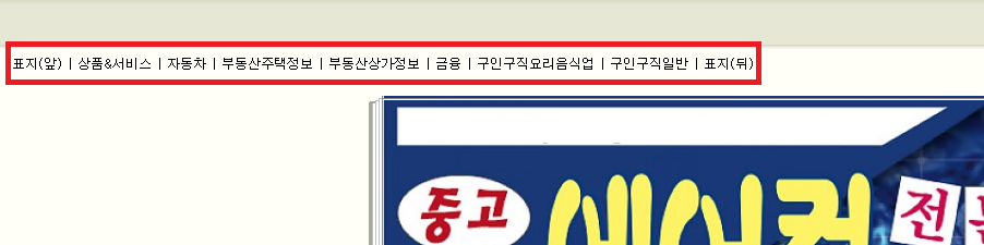 벼룩시장 종이신문그대로보기 페이지 위쪽에 보시면 정보별로 정리가 되어있는 다양한 메뉴들을 확인해보실 수가 있겠습니다. 해당 글자 중 하나를 눌러주시고 나면 눌러준 카테고리에 속한 다양한 정보들이 담긴 페이지로 바로 이동을 할 수 있는 것은 물론이거니와