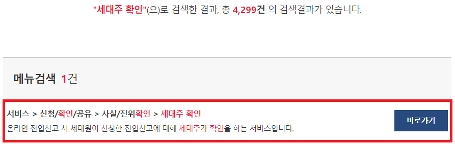 다른 검색 결과들은 전혀 상관하실 필요가 없겠습니다. 여러분들이 확인을 해야할 필요한 결과만 딱 표시를 해두었는데요. 메뉴검색이라는 공간에 세대주 확인이라고 빨간색으로 표시가 되어있는 항목이 보이시나요?