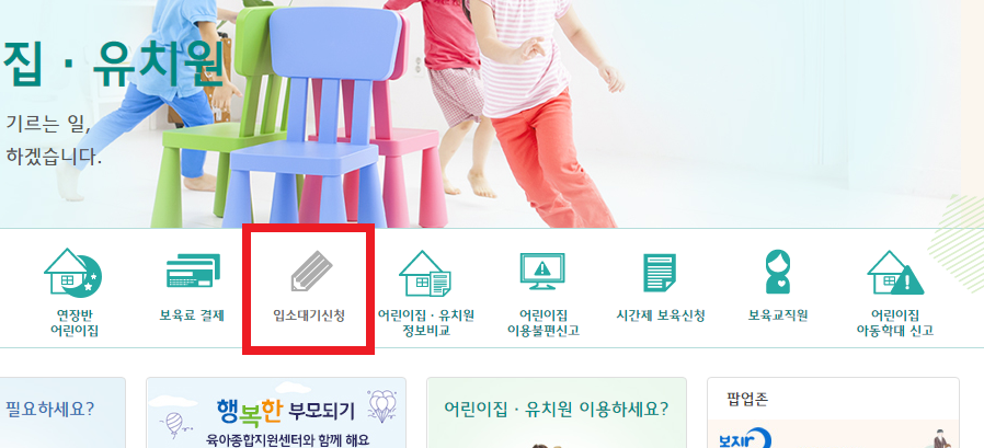 아무튼 아이디도 만드시고 그리고 로그인까지 하셨다면 이제서야 비로소 어린이집 입소대기신청을 하시는 것이 가능하겠는데요. 다시 메인 화면을 집중해주시길 바라겠습니다. 메인화면 중간쯤에 보시면 다양한 메뉴들이 있는 것을 확인해보실 수가 있겠는데요.