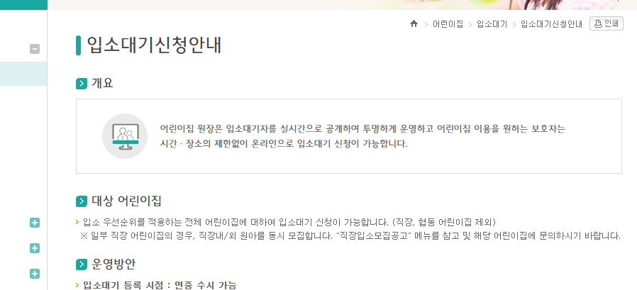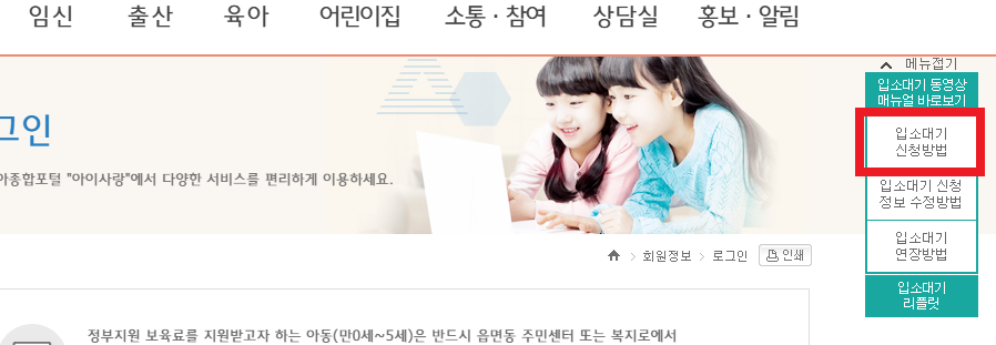 임신육아종합포털 우측에 보시면 입소대기 신청방법이라고 되어있는 메뉴가 펼치진 것을 확인하실 수가 있겠습니다. 처음 이용하시는 분들이라면 이 메뉴 충분히 활용을 해보시는 것도 좋은 방법이 되지 않을까 하는 생각을 해보는데요.