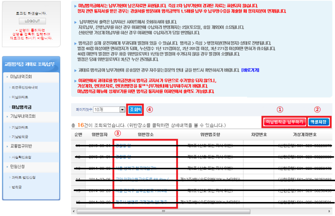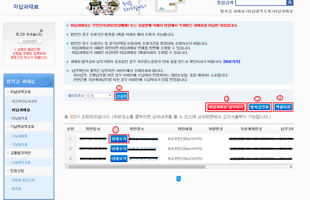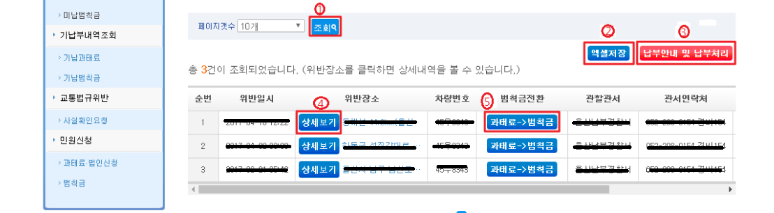 위에서 보시는 것처럼 그 자리에서 바로 위반 사항을 확인해보실 수가 있겠는데요. 해당 페이지에서 여러분들이 활용할 수 있는 몇개의 버튼이 숫자로 표시가 되어있는 것을 확인해보실 수가 있겠습니다. 다른건 크게 살펴볼 필요가 없는거 같고 상세보기만 좀 살펴주시면 되지 않을까 하는데요. 말 그대로 어떻게 단속이 되었는지 그 상세한 내용을 확인하실 수 있는 버튼이 되겠습니다. 그리고 3번으로 표시가 되어있는데요. 인터넷을 통해서 바로 납부도 하는 것이 가능하니 잘 활용해주시면 되지 않을까 생각이 됩니다.