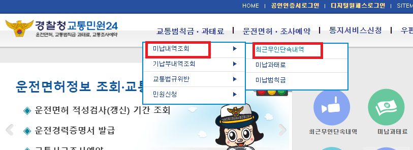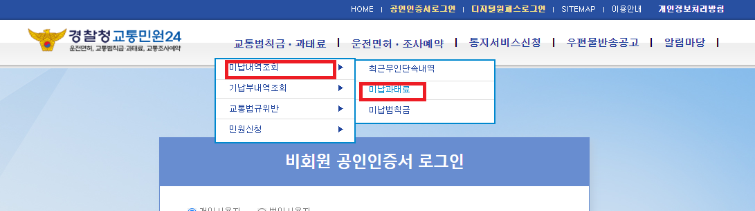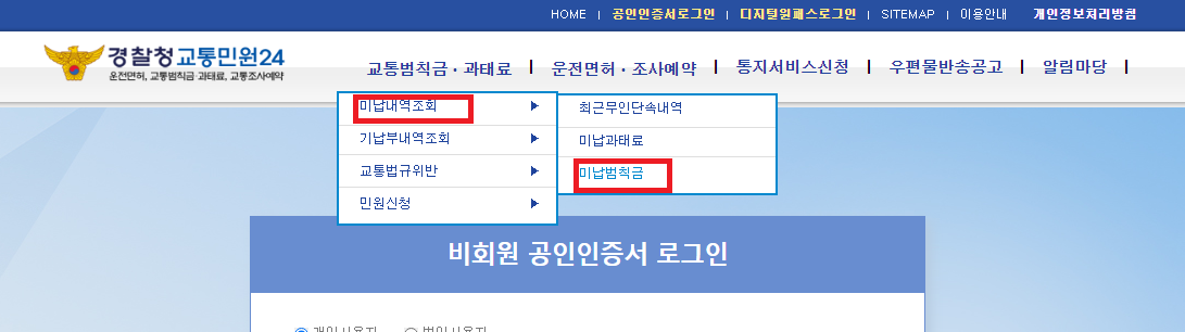 보시는 것처럼 교통범칙금.과태료라는 메뉴에 마우스를 올려두니 그 하단에 새로운 메뉴들이 나오게 되는 것을 확인할 수가 있었는데요. 메뉴들이 나오게 되면 빨간색으로 표시가 된 메뉴들을 차례대로 선택을 해주시면 되겠습니다.