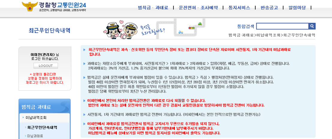 아무튼 위에서 살펴보신 것처럼 이파인 홈페이지를 통해서 최근무인단속내역을 확인할 수 있는 것은 물론이거니와 미납과태료나 미납범칙금에 관한 내역도 간단하게 조회를 해보실 수가 있겠는데요. 미납과태료를 확인하는 방법도 간단하게 좀 알려드리도록 하겠습니다.