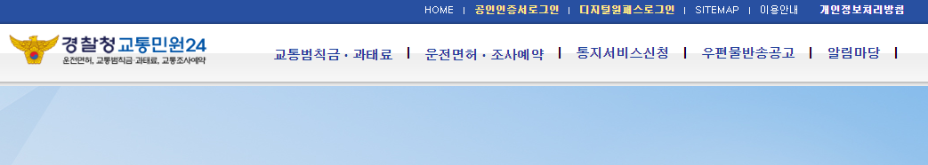 홈페이지 상단에 보시면 다양한 메뉴들이 있는 것을 확인해보실 수가 있겠는데요. 그중에서 가장 왼쪽에 있는 교통범칙금.과태료라는 메뉴를 활용해주시면 되겠는데요.