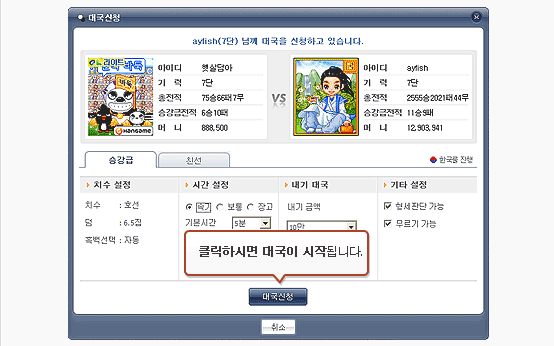 로그인 및 설치가 마무리가 되었다면 이제 대국실 입장하기라는 버튼을 눌러서 게임 진행을 위한 대기실로 이동을 하시는 것이 가능하겠는데요.