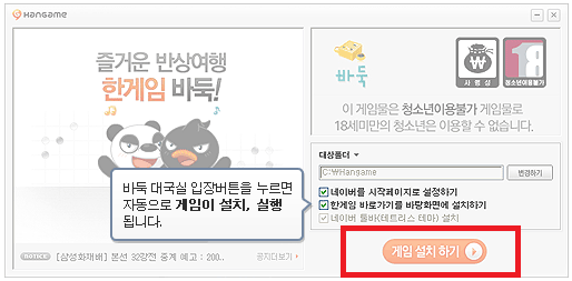 따로 파일을 찾아나서실 필요가 없습니다. 로그인을 하는 버튼 바로 위쪽에 보시면 대국실 입장하기라고 되어있는 버튼을 눌러주시면 되겠는데요. 만약 설치가 되어있는 경우라면 바로 게임을 플레이할 수 있는 대기실로 이동을 하게 될 것이고 만약 설치가 되어있지 않은 경우라면 설치를 위한 과정이 진행이 되겠는데요.