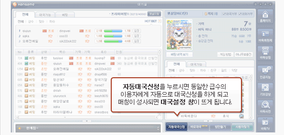 위에서 보시는 것이 무엇인고 하니 한게임바둑 바로가기 플레이를 위해서 모인 사람들이 대기를 하는 공간이라고 할 수가 있겠습니다. 이곳에서 대국을 하고자 하는 사람을 찾아서 플레이를 하는 것이 가능하겠는데요. 다양한 방법으로 게임을 즐기는 것이 가능하지만 가장 빠른 게임 즐길 수 있는 방법 한가지를 좀 알려드릴까 합니다. 바로 자동대국신청이라는 기능을 이용하는 것인데요.