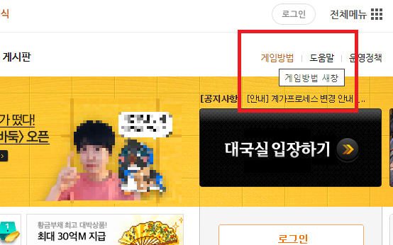 메인화면 우측 상단에 보시면 게임방법이라고 되어있는 조그마한 글자가 보이실텐데요. 해당 글자를 선택해주시게 되면 새로운 창 하나가 나오는 것을 확인하실 수가 있게 되죠. 새로운 창에 있는 좌측의 게임 시작하기 그리고 대국 신청하기라는 메뉴를 선택해주시면 되겠는데요.