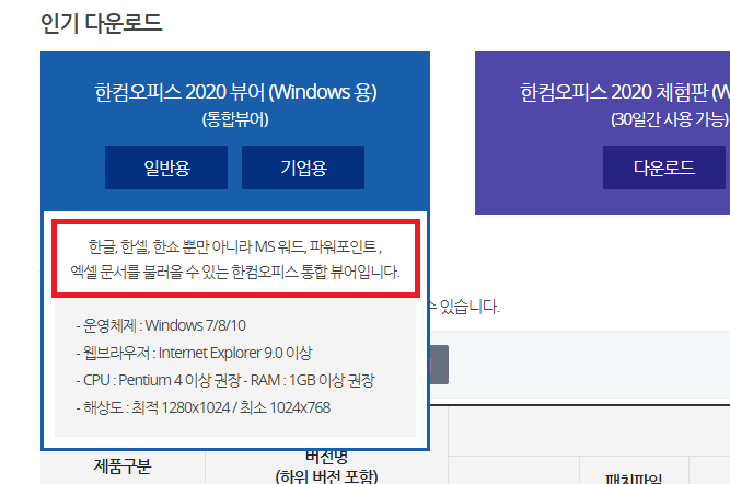 체험판을 받아볼 수 있는 페이지에 보시면 역시나 뷰어 파일도 간단하게 받아보실 수 있는 메뉴를 확인해보실 수가 있겠는데요. 개인적으로 사용을 하고자 하시는 분들이라면 일반용이라는 메뉴를 눌러서 파일 받아주시고서 설치 완료 그리고 사용을 해주시면 되겠습니다. 단순히 한쇼만 열 수가 있는 것이 아니라