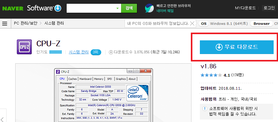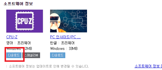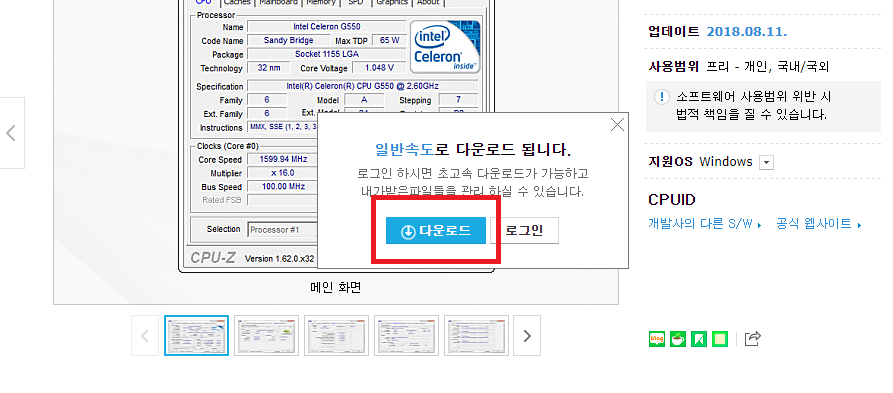 앞서서 알려드린 내용과는 달리 다른 포털사이트에서 검색을 하게 되는 경우 cpu-z의 다운로드가 가능한 안내를 바로 받아볼 수가 있었는데요. 다운로드라는 버튼을 눌러 페이지를 이동하시게 되면 그 우측에 무료 다운로드라고 되어있는 버튼을 확인해보실 수가 있겠습니다.