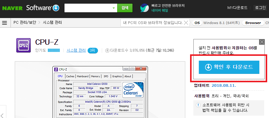 아무튼 당연한 이야기가 되겠습니다만 어떠한 걱정없이 안전하게 다운로드를 하기 위해서는 cpu-z 프로그램의 홈페이지를 이용하시는 것이 가장 안전하다고 할 수가 있겠습니다. 그래서 말인데 안전한 방법으로 지금 바로 여러분들의 컴퓨터 사양 체크를 해보시면 되지 않을까 하는군요.