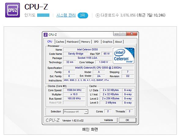 클릭 몇번만 해주시면 간단하게 그 자리에서 바로 설치 파일 받아보실 수가 있는데요. 중요한건 단순히 cpu-z 다운로드만 가능한 것이 아니라 프로그램의 실행화면을 간단하게 미리 볼 수가 있었다는 사실이죠.