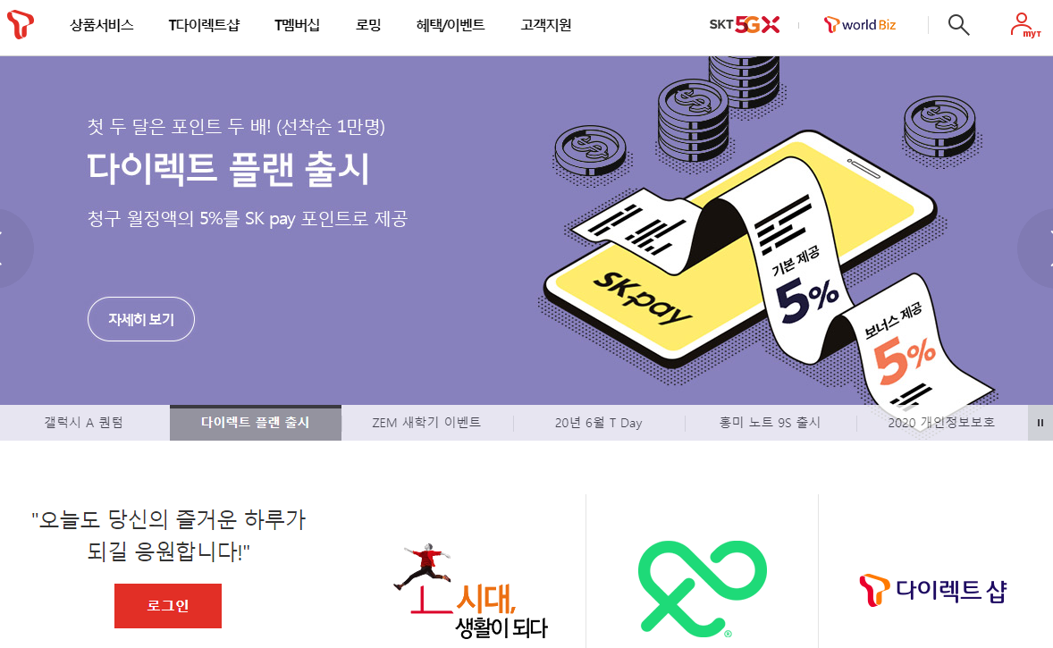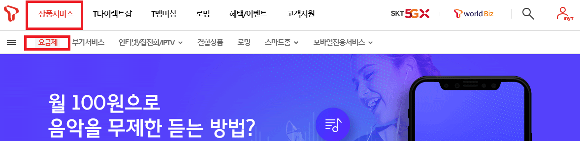 위와 같은 화면을 여러분들도 보고 있으신지요? 앞서서 말씀드린 티월드라는 홈페이지의 메인화면이라고 할 수가 있겠는데요. 굳이 skt 대리점을 가지 않는다 하더라도 집에서 다양한 종류의 요금제를 바로 확인을 하는 곳이 가능하죠. 바로 확인해보시면 될거 같은데요.
