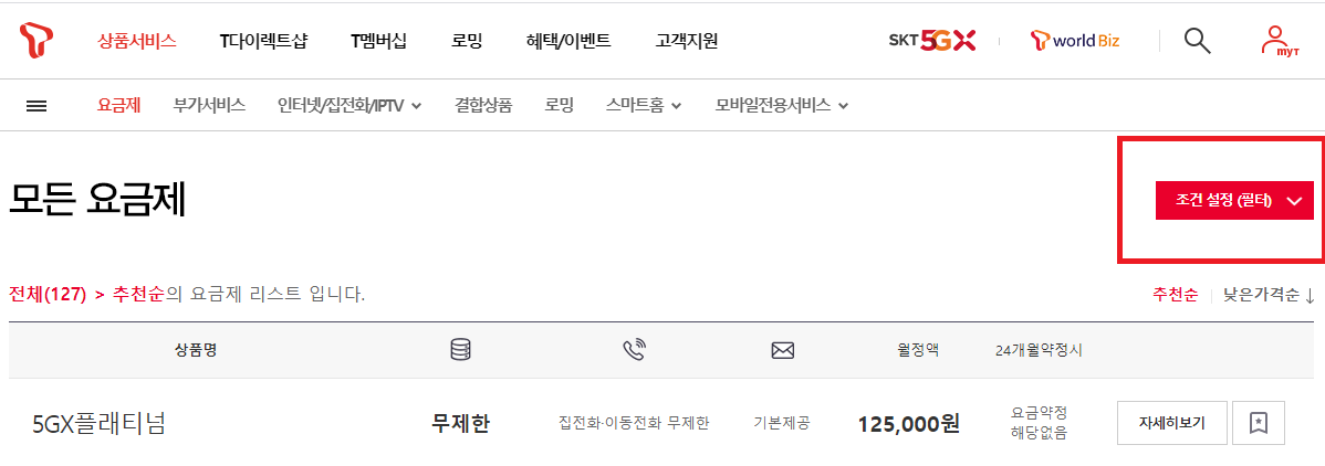 요금제 리스트들 우측 상단에 보시면 조건 설정이라는 필터 기능이 있는 것을 확인해보실 수가 있겠는데요. 조건 설정을 통해서 필터를 해주시면 나에게 적합한 요금제만을 추려서 보는 것이 가능하게 되겠습니다. 직접 한번 사용을 해볼까 하는데요.
