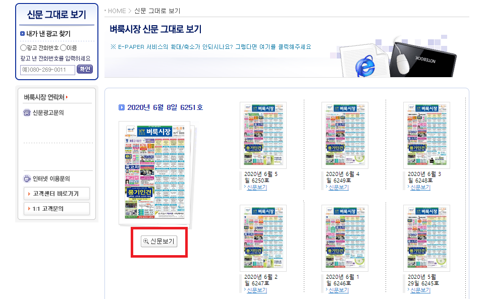 눌러주시고 나면 각각의 날짜별로 정리된 신문 이미지들을 확인하실 수가 있게 되겠는데요. 그리고 각각의 이미지 하단에 보시면 신문보기라는 글자가 있는 것을 확인해보실 수가 있겠습니다. 이 메뉴를 눌러주시는 것으로써 종이 형태로 되어있는 벼룩시장을 인터넷에서 그대로 볼 수가 있게 되겠는데요. 직접 한번 눌러보도록 하겠습니다.