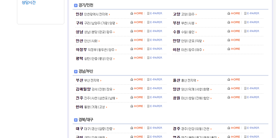 여기에서 여러분들이 거주를 하고 있으신 혹은 생활정보를 얻고자 하는 지역을 찾아주시면 되겠습니다. 그리고 지역을 찾아주셨다면 지역 우측에 있는 <E-PAPER>라고 되어있는 글자를 눌러주시면 되겠는데요.