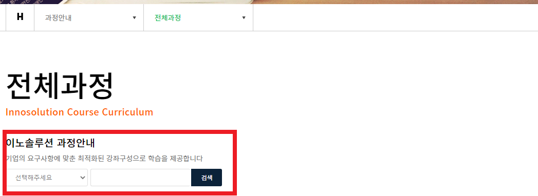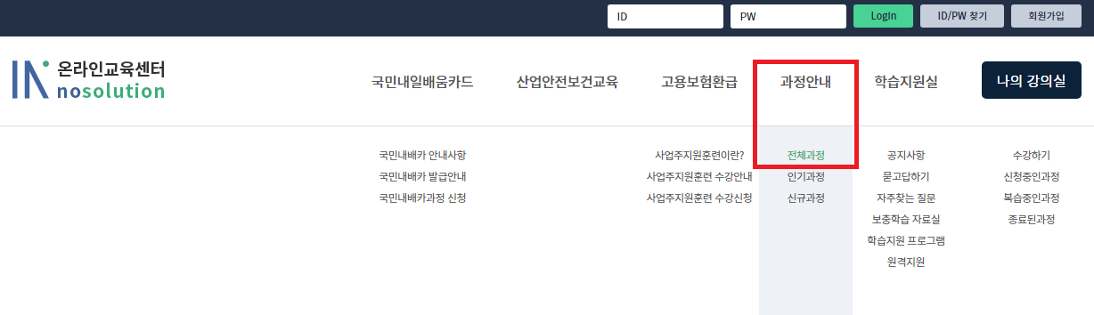메인화면 상단에 보시면 큰 글자로 이루어진 몇몇 메뉴들을 보실 수가 있으실테고 그리고 마우스를 올려두시면 그 하단에 새로운 하위 메뉴들이 또 나오는 것을 확인해보실 수가 있겠는데요. 과정안내 > 전체과정이라는 메뉴 순서대로 이동을 해주시면 되겠습니다.
