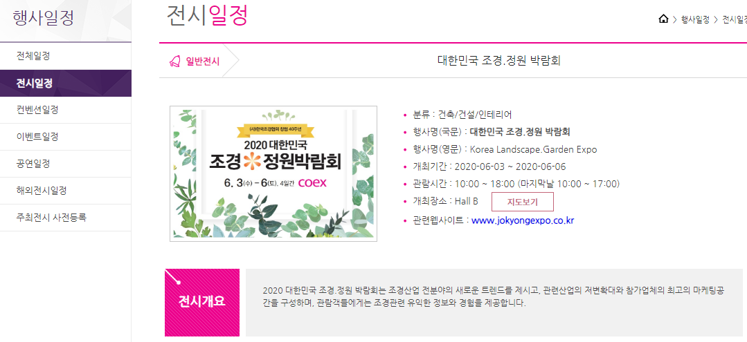 개최장소가 어디인지 확인을 할 수가 있으니 개최장소부터 파악을 해두신 다음 지도보기라는 메뉴를 이용해서 여러분들이 선택을 한 전시회가 어디에서 개최가 되는지 바로 확인을 하는 것이 가능하게 되겠습니다. 코엑스에 처음 방문을 하시는 분들이라면 더더욱 확인을 해야하는 중요한 정보가 아닌가 생각이 됩니다. 아울러 처음 방문하시는 분들이라면 추가적으로 또 확인하시면 좋을 정보들도 있는데요. 메인화면 보신 분들은 아마 다들 눈치를 채셨지 않으셨을까 하는데요.
